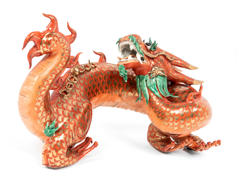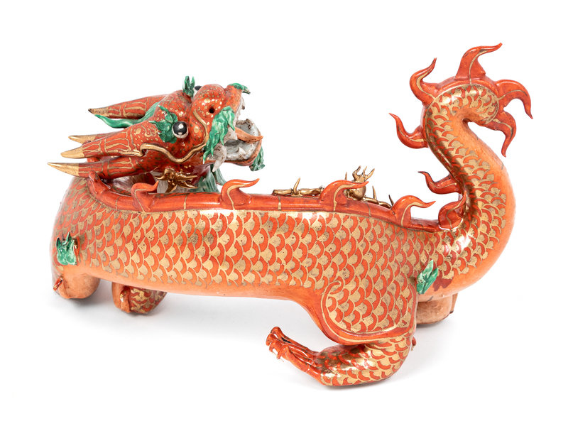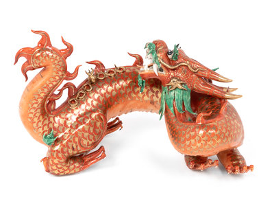 A Chinese Coral Red Ground Gilt and Green Enameled Porcelain Figure of Dragon