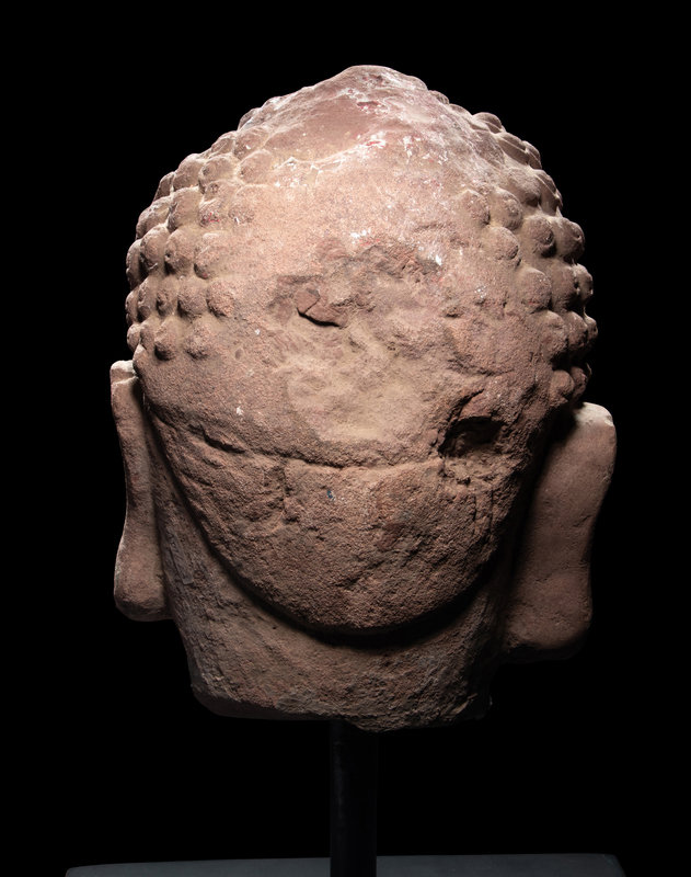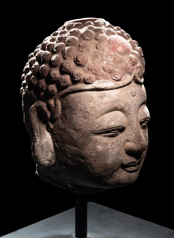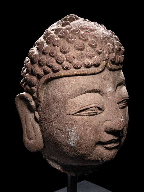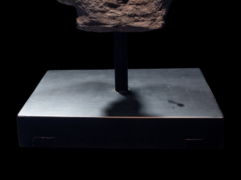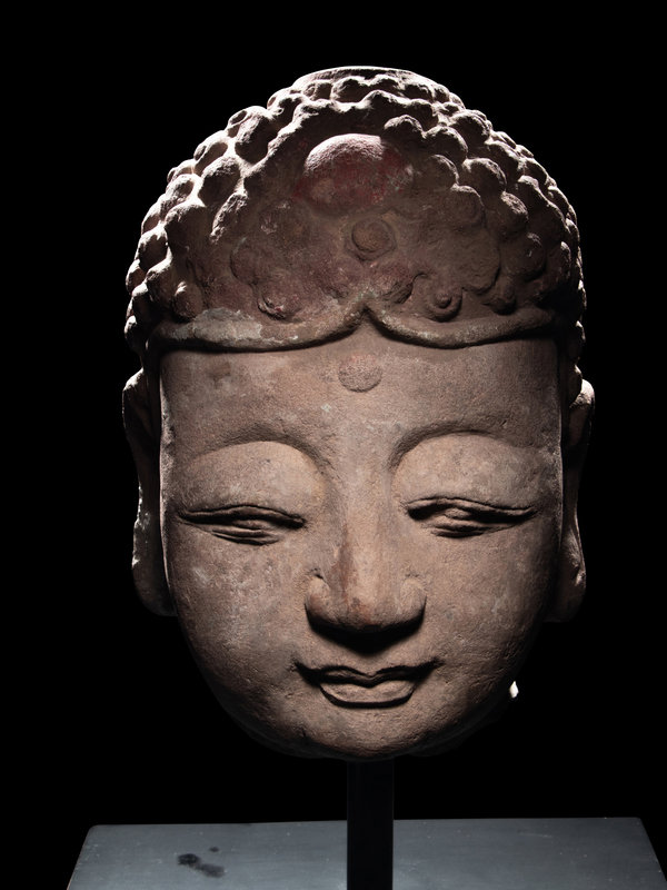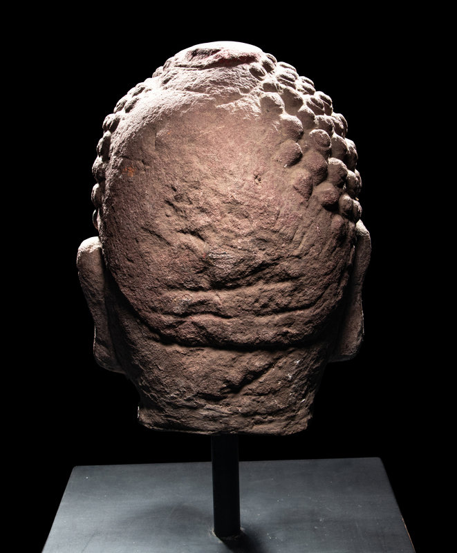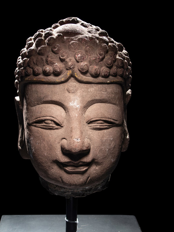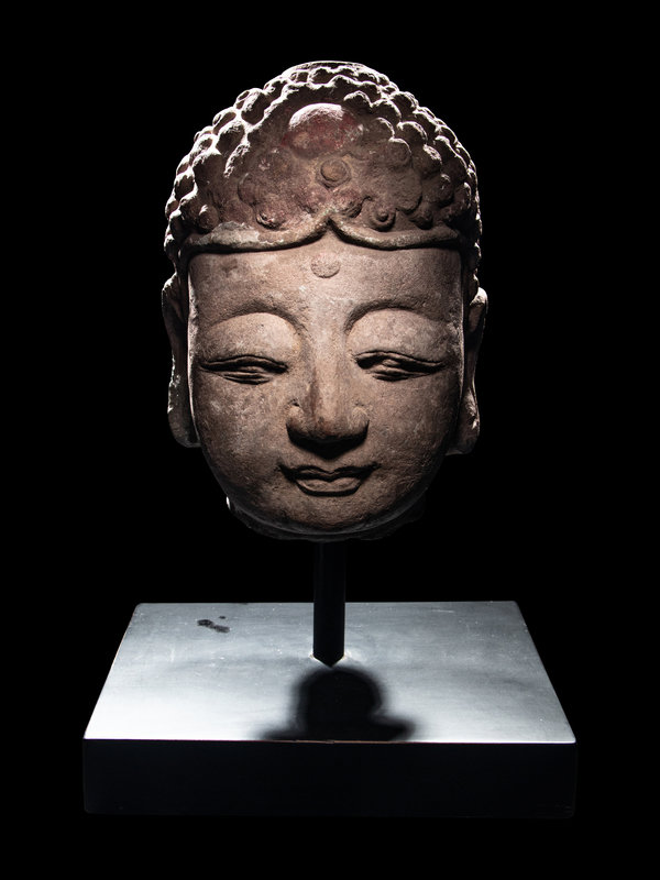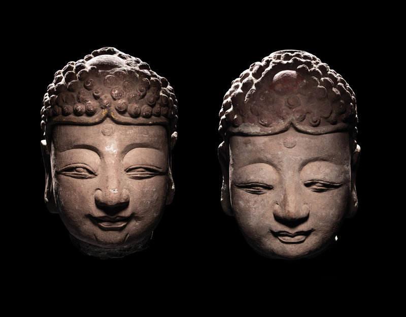 each carved from a grey dappled stone, having furled knobs of coiled hair surrounding an ushisha, heavilly lidded almond eyes beneath an arching eyebrow outline, and plumb lips upturned to a soft smile.