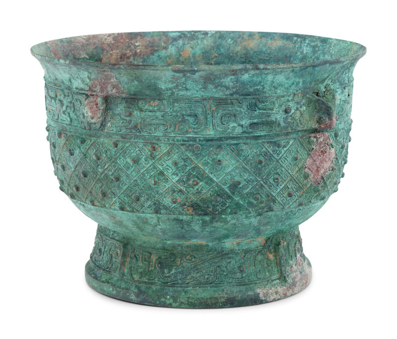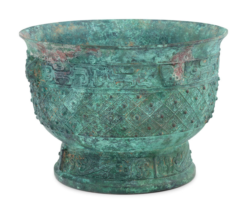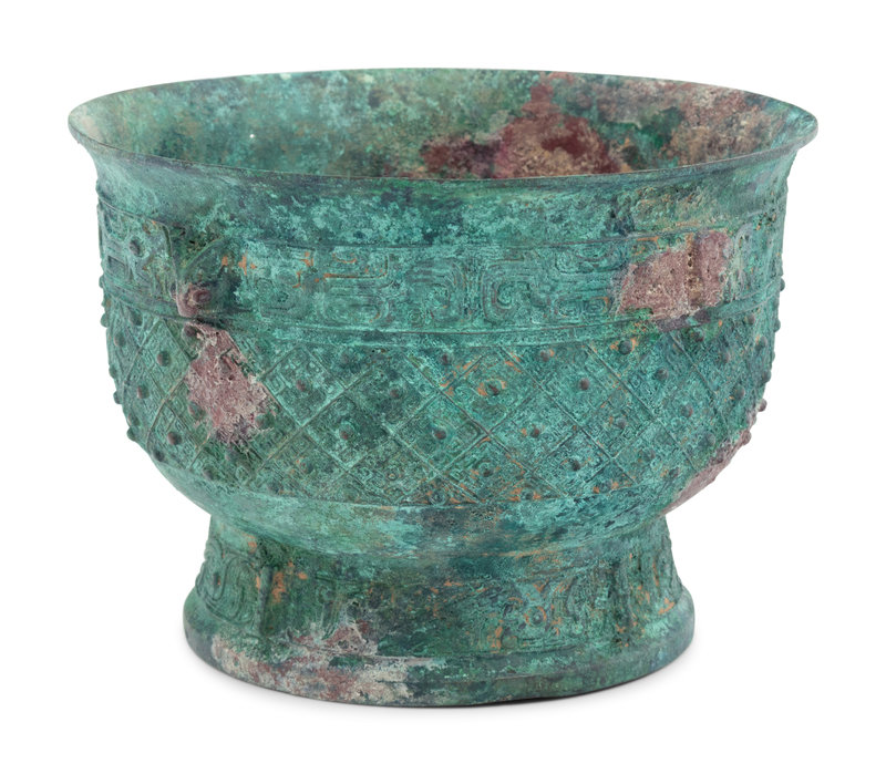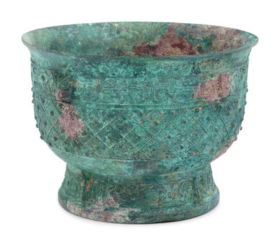 having steep rounded walls resting on a tall, slightly splayed foot, the exterior decorated with a band with stylized dragons above a diamond-and-dot design, and stylized beasts on the foot.