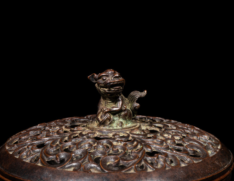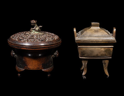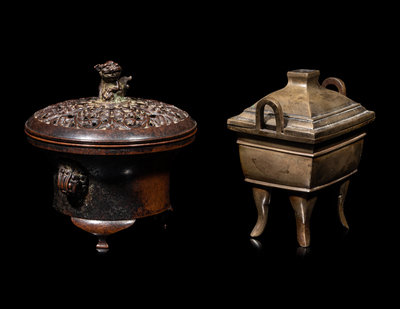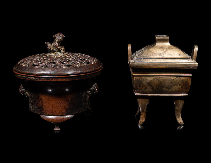 comprising one tripod example, fitted with a reticulated cover surmounted in a roaring beast-form finial, and one of square section with upturned u-form handles.