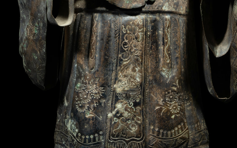 the figure depicted standing, deftly incised with wise facial features and ornate robes emblazoned with attributive symbols.