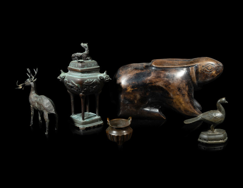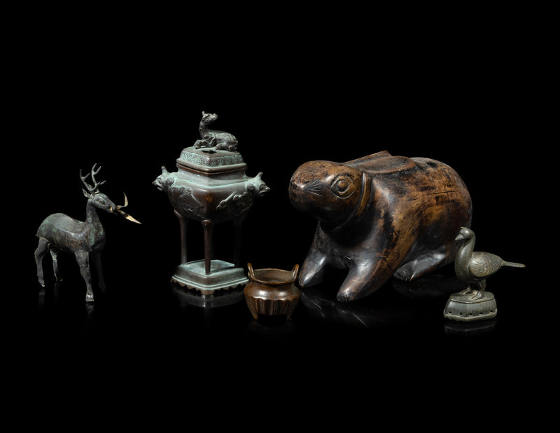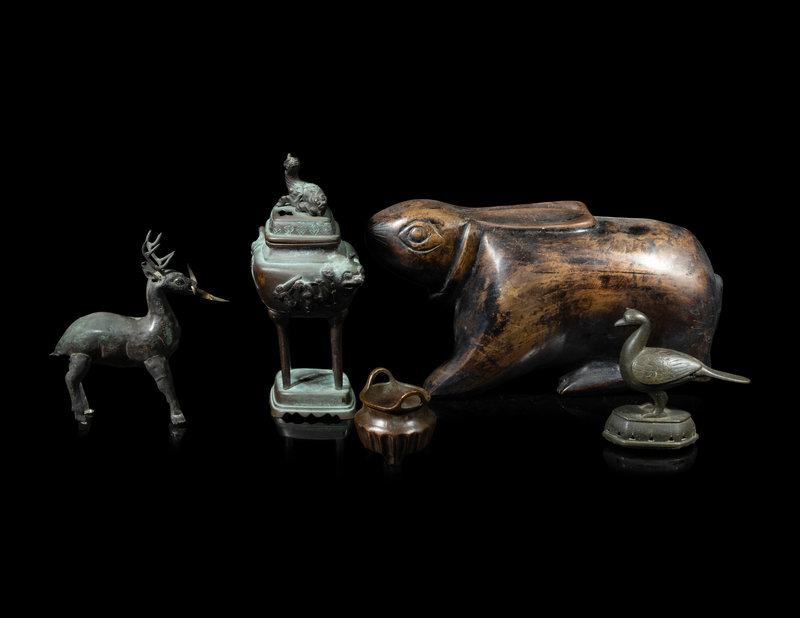 the first a Chinese silver figure of a deer, the second a small Chinese incense burner, the third a Japanese covered censer, the fourth a Southeast Asian bell, and the fifth a figure of a rabbit.