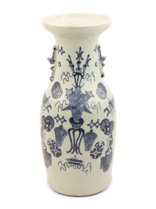 molded with opposing beast-form handles on either side of the neck before the flaring upturned mouth, the body painted with various antiques.