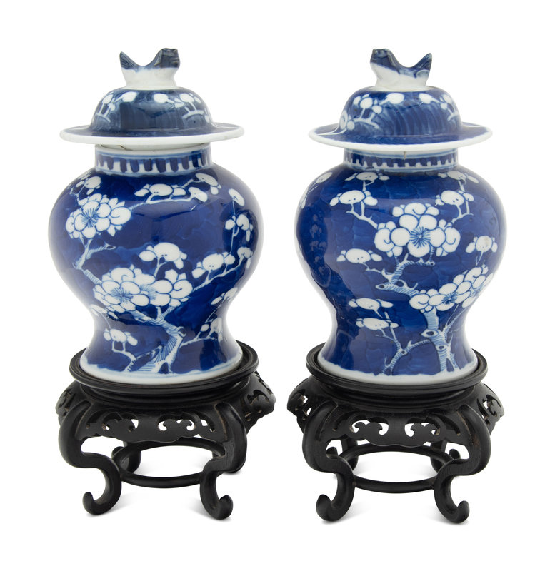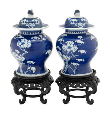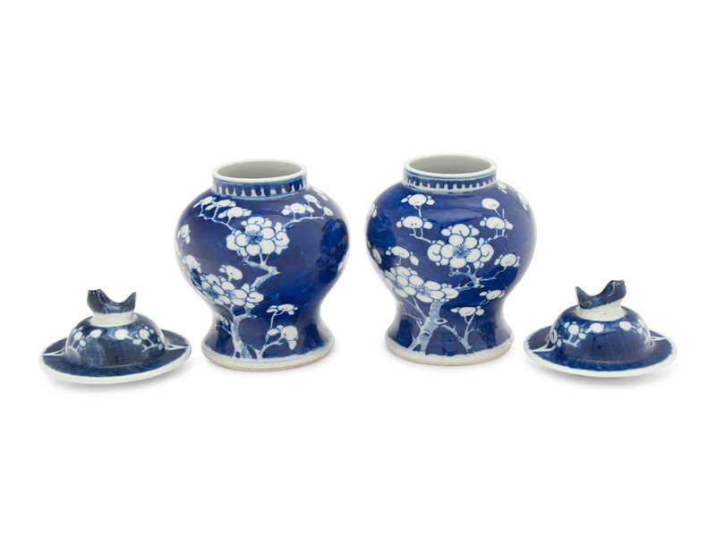 A Pair of Chinese Blue and White 'Cracked Ice and Prunus' Porcelain Covered Jars