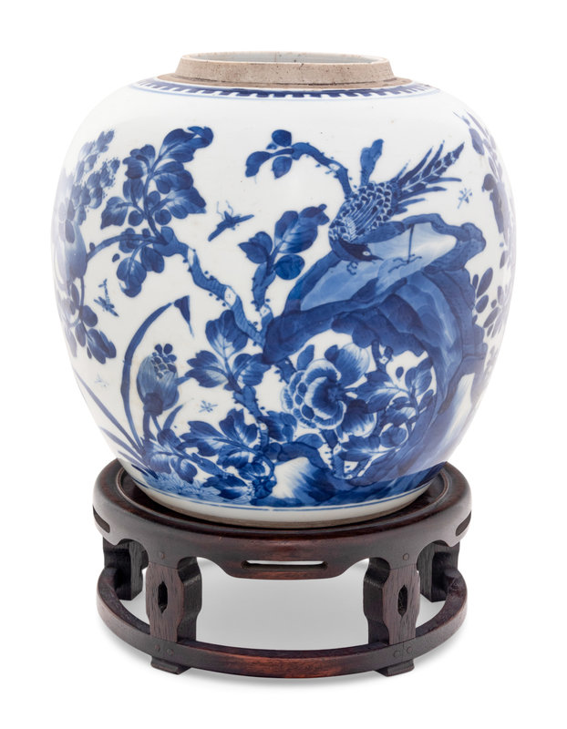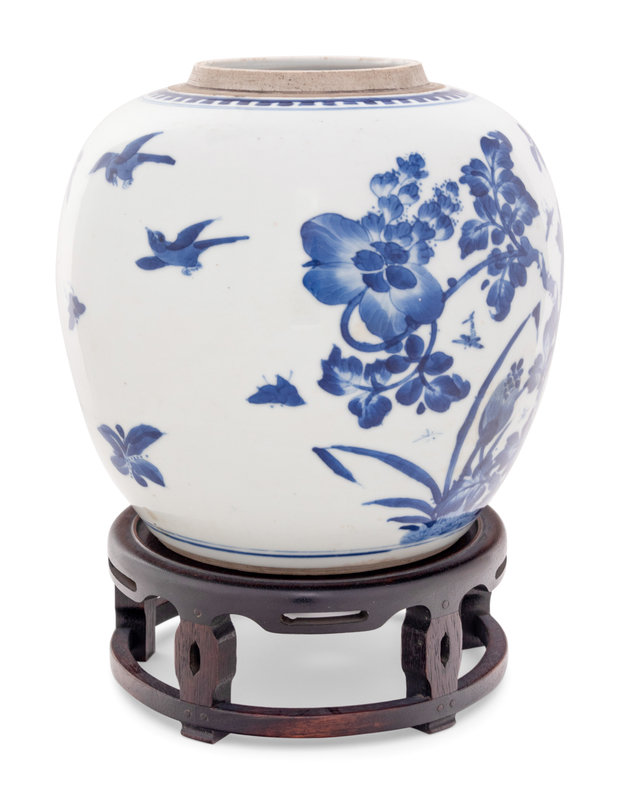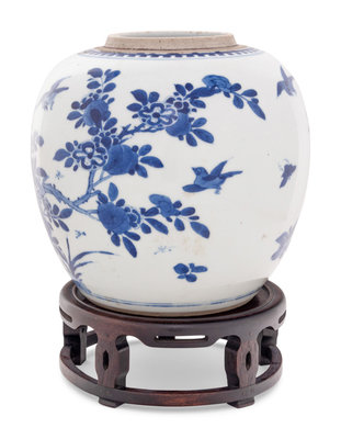 the near-sperical body supported above a wide foot, narrowing at wide shoulders to a slightly everted lip surrounding the mouth opening. The walls richly painted with a continuous scene of birds fluttering about flowers and rockery, all raised above a reticulated stand worked with large open panes divided by lozenge-form columns and joined by stretchers.