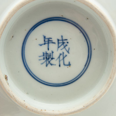 potted with rounded walls supported by a straight foot, the interior painted with a chiwen soaring amidst flamelike cloud wisps.