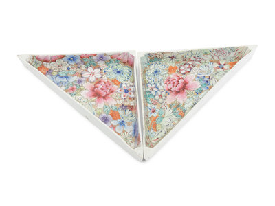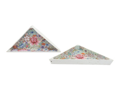 the first a covered stem bowl, the second a pair of triangle 'millefleur' dishes.