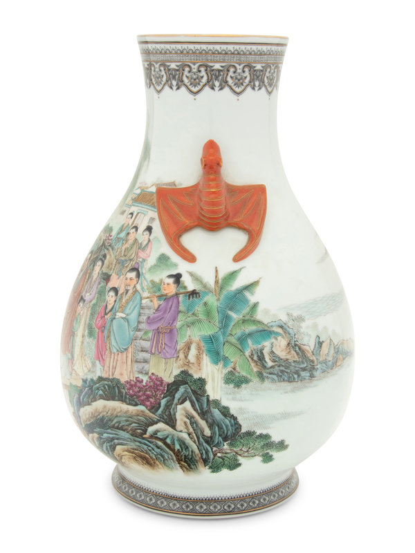 having a low globular body flanked at the neck with molded copper-red glazed mock handles in the form of open-mouthed bats; the body of the vase painted with a continuous figural scene. Together with a hardwood stand.