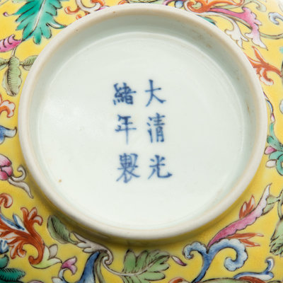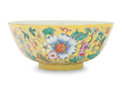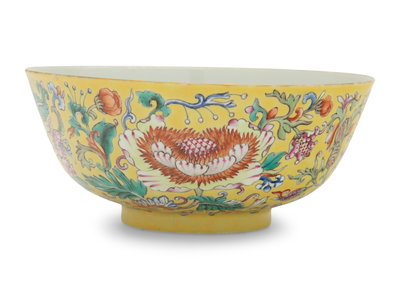 A Chinese Yellow Ground Famille Rose Porcelain Bowl