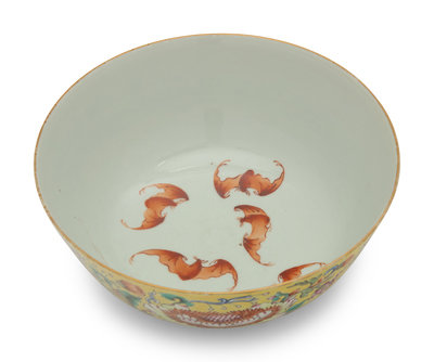 the deep slightly flaring walls enameled to the exterior with a bouquet of flower blossoms issuing from verdant fruit-bearing scrolls against a yellow ground, the interior with five circling bats.