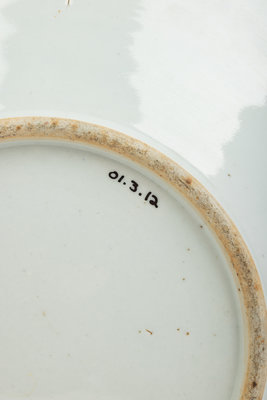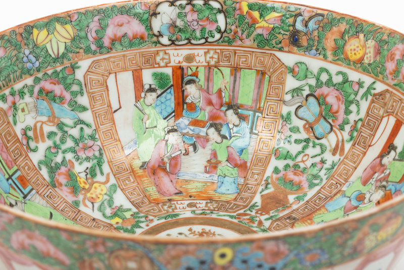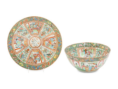 the first a charger of circular form and the second a bowl having a tapered body upon a smaller foot; both having an inscribed central roundel, surrounded by figural scenes and having an outer border decorated with plants, birds, and insects; made for the Persian market.