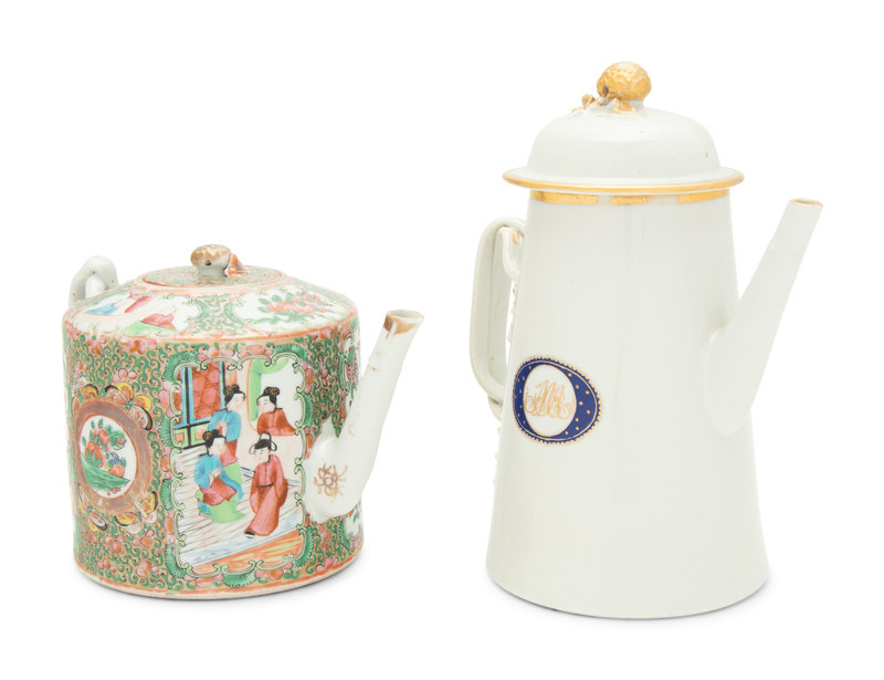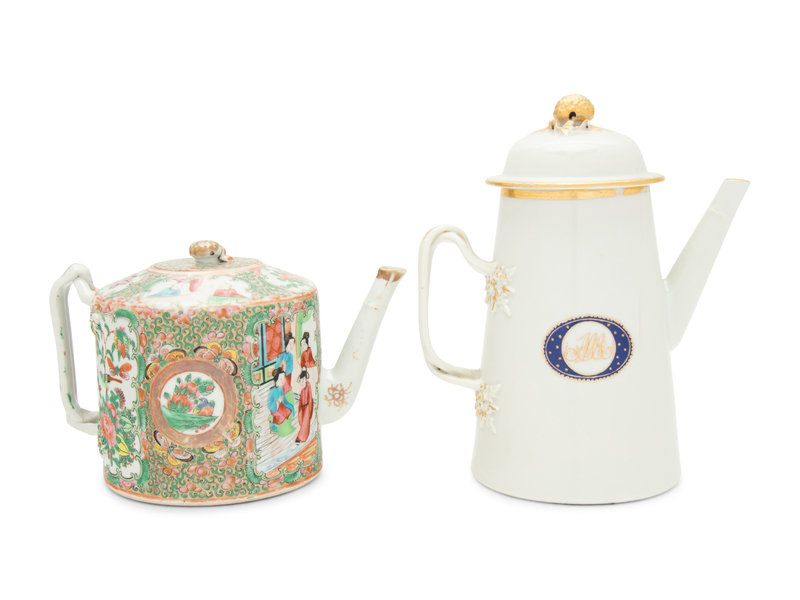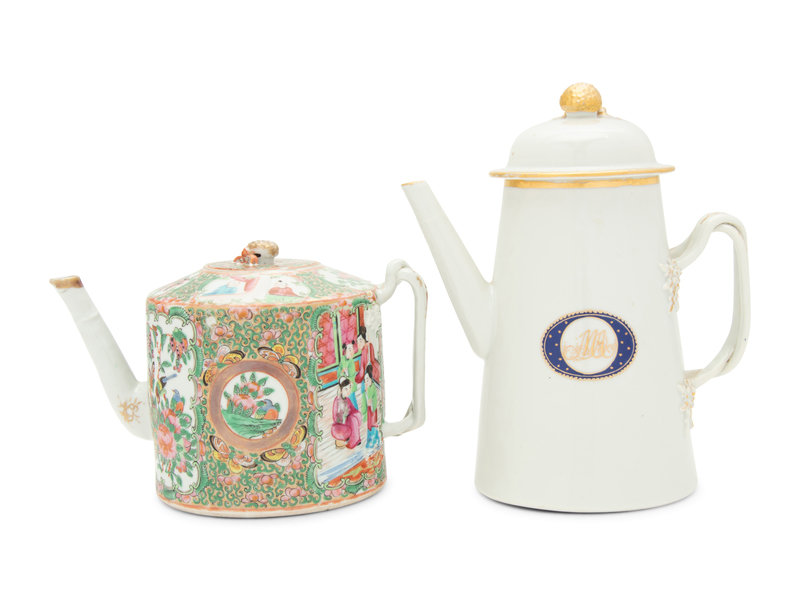 the first a squat cylindrical example decorated in a rose medallion pattern, the second an 'armorial' example gilt with monogram 'MA', of tapering form and surmounted by a domed cover terminating in a gilt fruit-form finial.