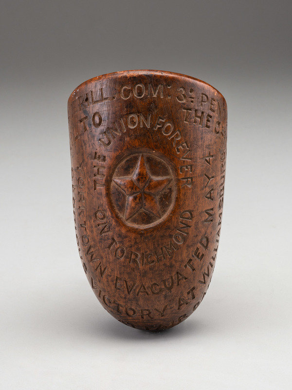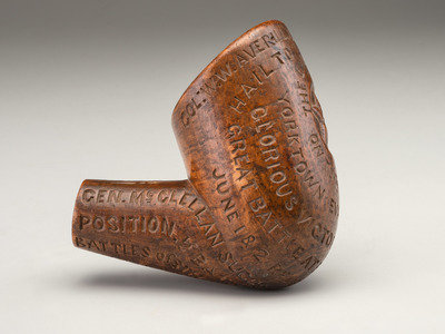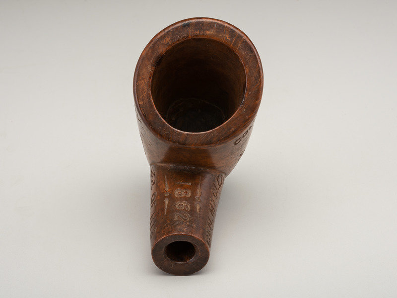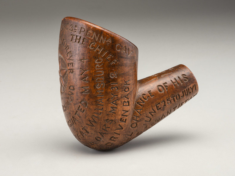 Along the rim of the pipe bowl: "Col: [sic] W.W. Averill [sic], Com: [sic] 3d Penna. / Cav." and just below that "Hail to the Chief." Center star surmounted by "The Union Forever" with "On to Richmond" below. Remainder of the bowl with battle details from regimental engagements during a bloody spring of 1862: "Yorktown Evacuated May 4" (reference to the Siege of Yorktown, April 5-May 4, 1862); "Glorious Victory at Williamsburg" (Battle of Williamsburg, May 5, 1862); "Great Battle at Fair Oaks May 31 & June 1 & 2 Rebels Driven Back" (Battle of Seven Pines, Fair Oaks, May 31-Jun 2, 1862). Stem with "General McClellan Successful Change of His Position. Battles June 25 to July 1" (reference to the Seven Days Battles, Jun 25-Jul 1, 1862)" and "Battles of Sth. Mts. & Antietam / September 14 & 17" (reference to Battles of South Mountain and Antietam, fought on Sept 14 and 17 respectively). Top of stem inscribed "1862" between artistic flourishes.