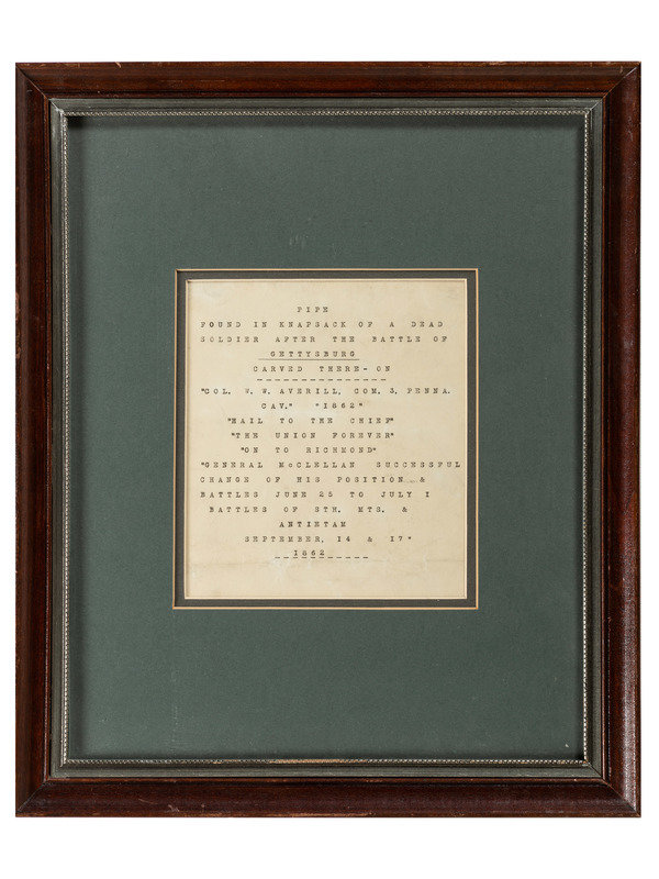 [With:] Typed note, 6 1/4 x 7 1/4 in. (sight), framed to 17 x 14 1/8 in. (creasing at folds, light soil, unexamined outside frame). Note indicates the pipe was "Found In Knapsack Of A Dead / Soldier After the Battle Of / Gettysburg" and includes portions of text inscribed on pipe.