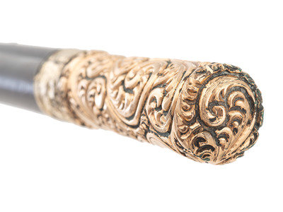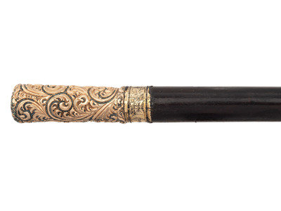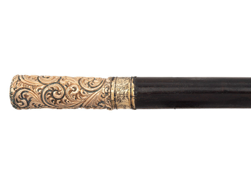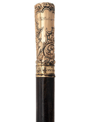 33 1/4 in. wooden cane with ornate 3 1/8 in. gold-plate floral scroll handle and 1 1/8 in. ferrule. Handle inscribed "W.B. Palmer" in unadorned portion of design, and at bottom of handle "Genl. W.H. Jackson."