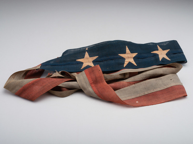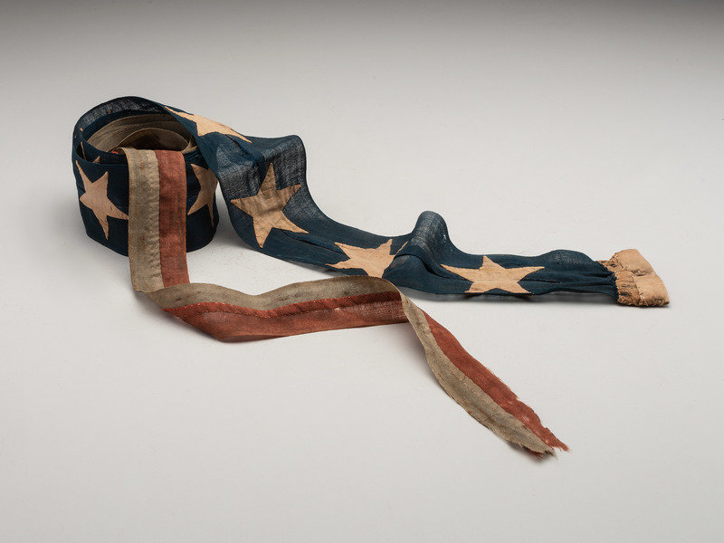 Approx. 22 ft. long., worsted wool, handsewn pennant with 13 double-appliquéd cotton stars hand sewn to 3 1/2 in. wide blue canton complete with stripes of red and white (soiling throughout, wear to edges incl. tearing, fraying, and holes especially near tapered end, some residue, toning and soiling to stars). Hoist is cotton with whip-stitched eyelet, "No. 3" stenciled on one side.