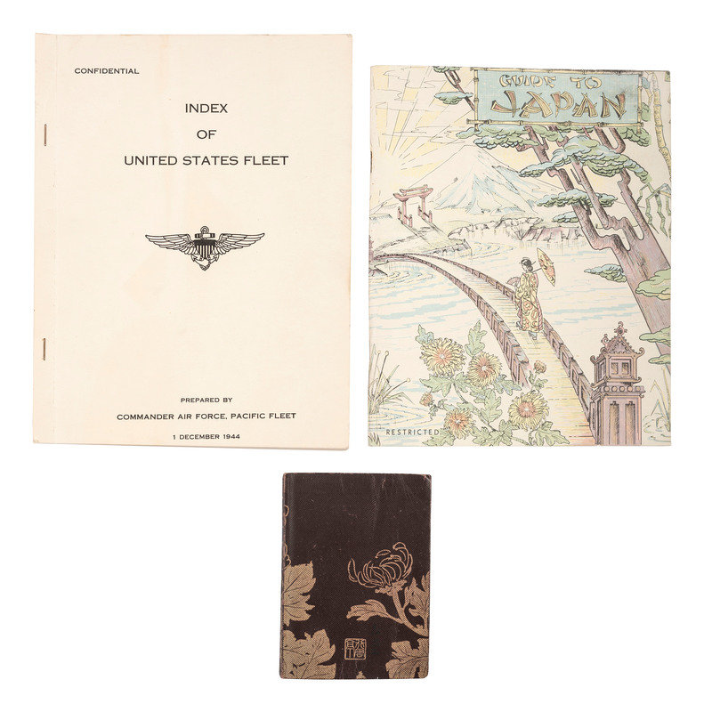 [Also with:] Index of United States Fleet. N.p.: Commander Air Force, Pacific Fleet, 1 December 1944. 4to (8 x 10 1/2 in.). Marked "Confidential," the 128-page dossier includes a listing of all then extant US Navy vessels with commission dates, separated into classes, with most classes illustrated by a photo of a representative vessel. -- Guide to Japan. N.p: CINCPAC-CINCPOA, 1 September 1945. 4to. Illustrated throughout. Original pictorial wrappers. A primer on Japan for American troops early in the occupation. Marked "Restricted." -- Together, 2 publications issued by the United States military for internal use.