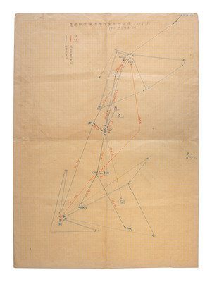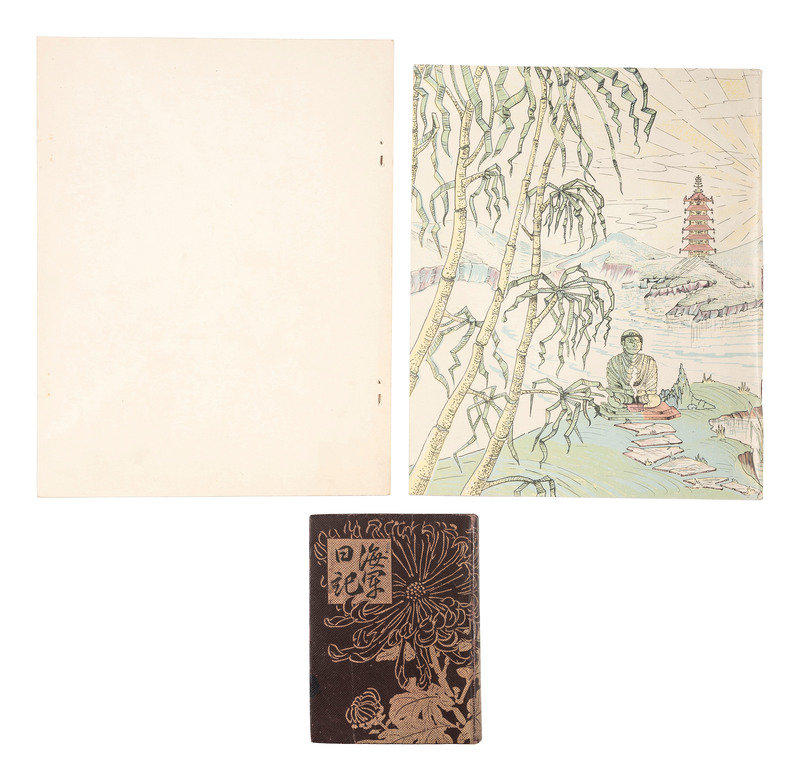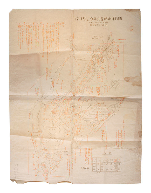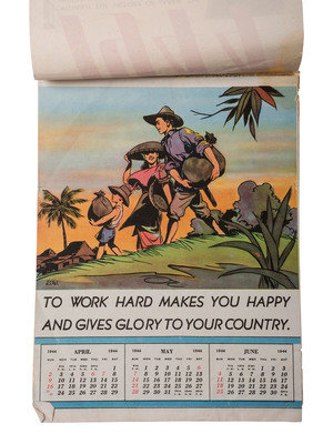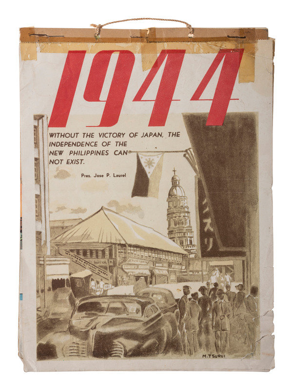 [With:] Captured Japanese partly-printed calendar diary with numerous entries in Japanese. Various locations, 1943 (Showa 18). 32mo (3 3/4 x 5 1/8 in.). Maps and illustrations of traditional and patriotic scenes. Original illustrated brown paper wrappers (front hinge separated, light creasing to rear board). Rear free endpaper stamped, "Examined in the Field Passed by Joint Intelligence." -- Saipan Army Air Defense Corps Command Communications Network. [サイパン陸軍防空隊指揮用通信網要圖]. [Saipan], n.d. 15 3/8 x 21 1/16 in. manuscript map in red and blue pencil on graph paper (minor creasing). Titled in Japanese in pencil. English note to verso reads: "Saipan / AA positions." -- Peleliu Chorographical Materials [ペリリュウ島兵要地誌資料圖]. N.p.: N.p., 1944 (Showa 19). 21 1/2 x 28 7/8 in. map printed in black and red on two sheet joined at center (creasing, a few stains, minor toning). Pencil note in Japanese to lower-left corner, dated 4 December n.y. The Battle of Peleliu occurred between 15 September and 27 November 1944 as a part of Operation Forager. The 1st Marine Division and the 81st Infantry Division met pronounced resistance from Japan's island-defense tactics and well-crafted fortifications. -- 1944 Calendar issued by the Japanese occupation authority of the Philippines. 8 x 11 in. string-bound hanging calendar (pages unordered, tape repair at top, short tears and creasing at edges). Each page features a propaganda message, including the cover: "Without the victory of Japan, the independence of the New Philippines can not exist." -- Together, 4 captured items from a Japanese soldier.