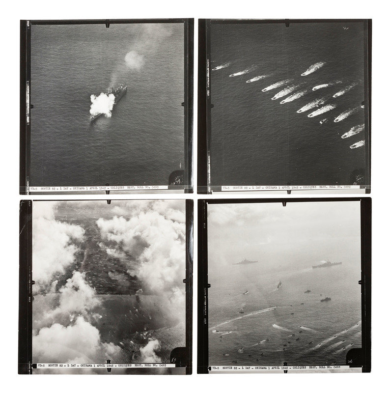 53 reconnaissance photos from the Battle of Okinawa. Okinawa, 1 April 1945. Each approx. 7 1/2 x 7 1/2 in. (excellent condition with only very minor wear to edges and corners). Each captioned in negative: VD-5 Sortie - L Day - Okinawa 1 April 1945 - Obliques Rest. Roll No. 0493." Includes views of capital ships, transports, and landing craft, some singly, most in formation, plus shots of the beaches and immediate interior of Okinawa.