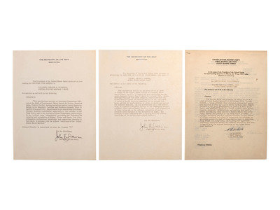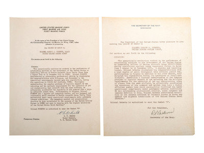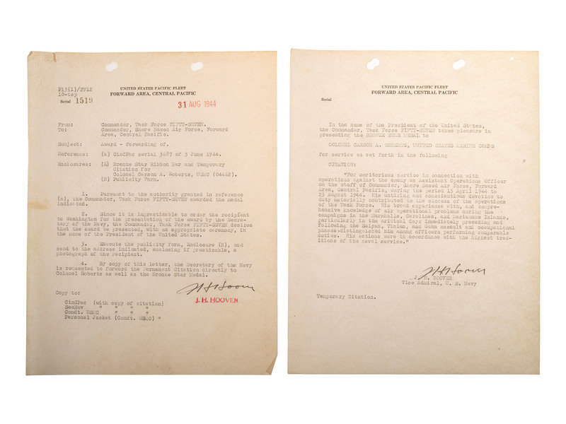 [Also with:] One binder housing biographical material related to Roberts including a 122pp oral history typescript from a 1971 interview with the general. A second binder houses original letters with citations conferred upon Roberts and signed by multiple military officers including Secretaries of the Navy John L. Sullivan and Robert Anderson.