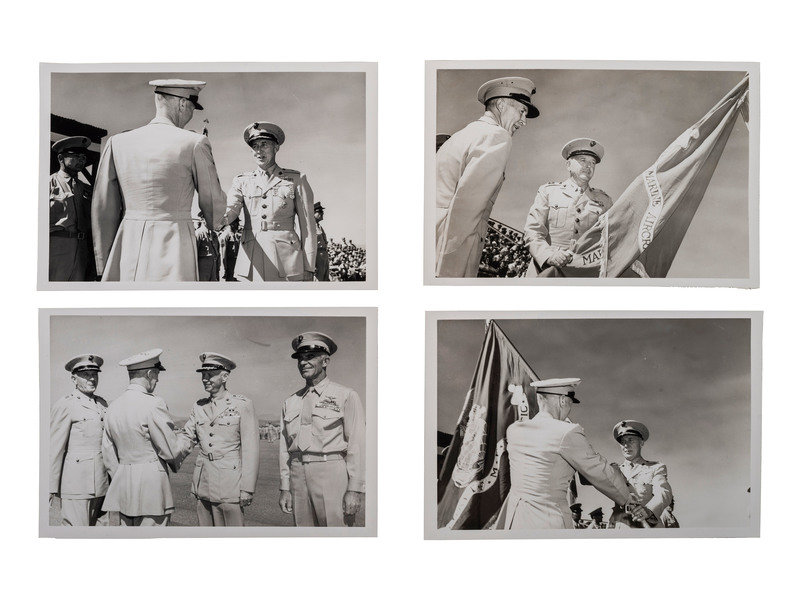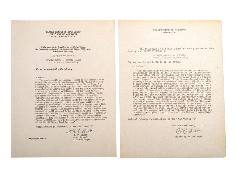 [With:] A group of 16 black-and-white and color photographs ranging in size from approx. 8 x 10 in. to 5 x 7 in., featuring images of Roberts in uniform, flight suit, and participating in a USMC ceremony.