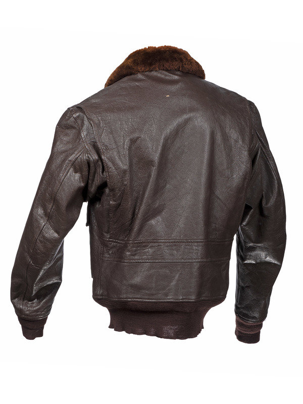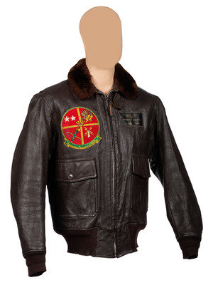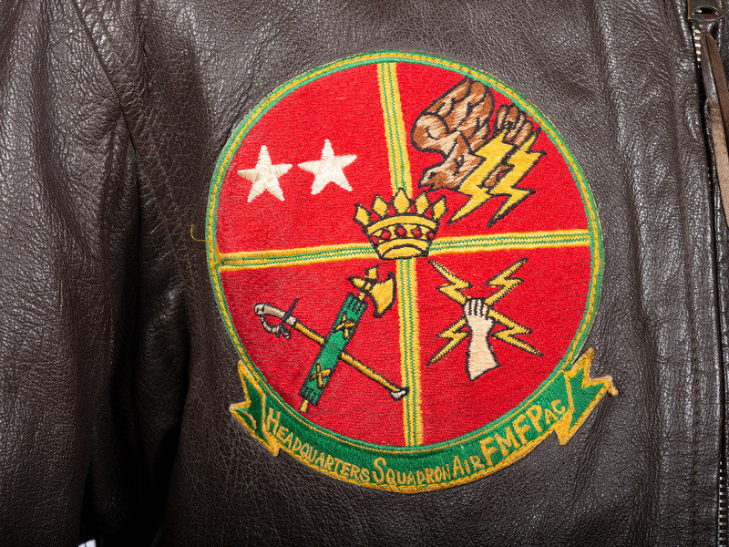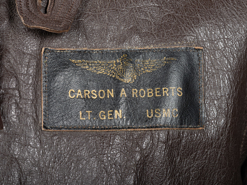Dark brown leather G-1 bomber jacket. Interior label below coat hook reads: "Bureau of Aeronautics USN / Flight Jacket, Intermediate, G-1 / Specification No. Mil-J-7823 (AER) / L.W.Foster Sportswear Co., Inc. / Contract No. DA-36-243-QM (CTM) 2312 / Size 40." To the right chest is sewn a 5 3/8 x 5 7/8 in. embroidered patch of the "Headquarters Squadron Air FMFPAC" with four quadrants. At left breast sewn leather patch identifies coat to owner "Carson A Roberts / Lt. Gen. USMC."