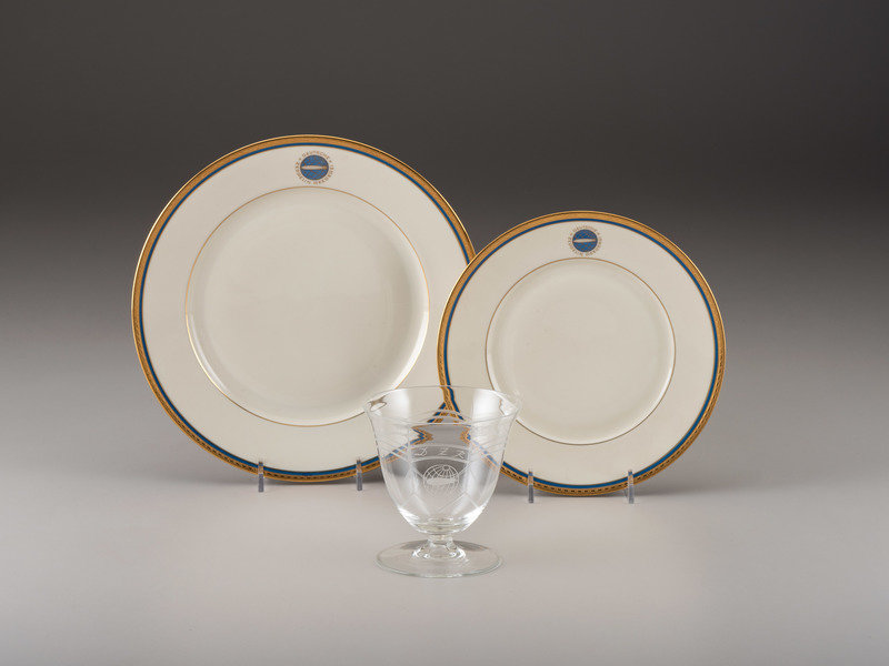 This collection of Zeppelin china comes from the family of McKendree B. Hutchins (1916-2009), who was inducted into the US Army Air Corps on 6 January 1942. He trained in the US and Iceland and was assigned to the Ninth Air Force Service Command after arriving in England. Hutchins landed at Omaha Beach on 12 June 1944, D-Day +6. During his time in the Army, he rose to the rank of master sergeant, receiving four silver stars and a purple heart. Hutchins' service took him from Normandy, to St. Mere Eglise, Bastogne, and the Battle of the Bulge, and he was in Ulm, Germany when the war ended. Because of his rank in the Quartermaster Corps, Hutchins was often in a position to help others, and in one case, he was offered porcelain dinnerware and crystal sherbets in return for his assistance. Hutchins turned the gift down, however, the man was so grateful that he searched out Hutchins' address in Chicago and shipped the gift to his wife at home. Hutchins only found out about the thank you gesture when he returned home in October 1945. The Zeppelin pieces remained in his family until his death in June 2009.