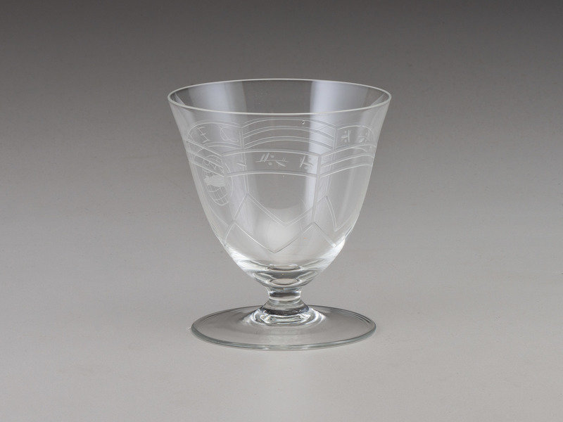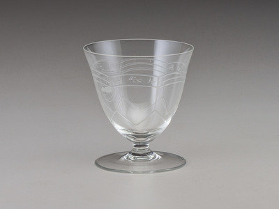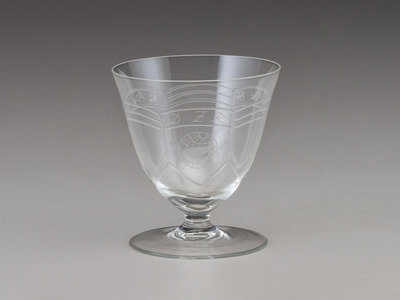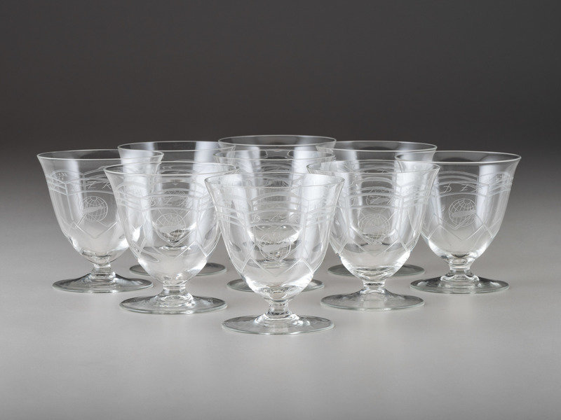 Nine (9) Deutsche Zeppelin-Reederei sherbet glasses, ca 1936-1937. Height 4 in., 3 3/4 in. diameter. Each with fine etch work, marked "D Z R" and decorated with the logo of the Deutsche Zeppelin-Reederei.