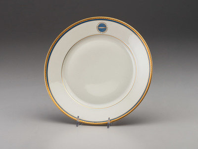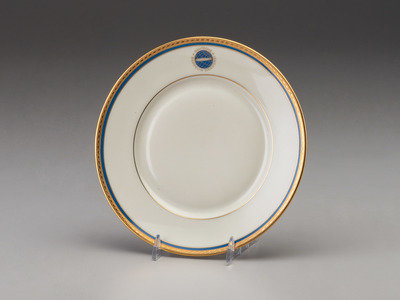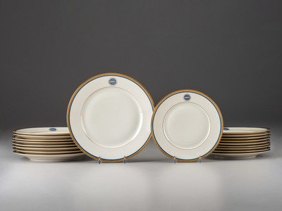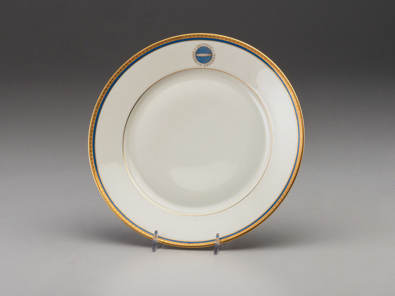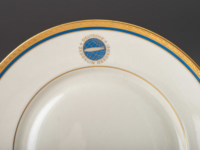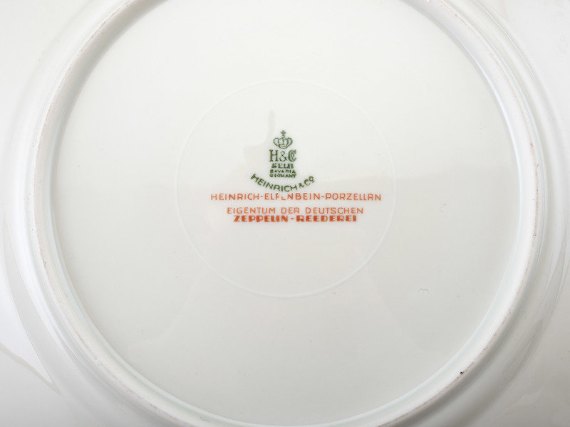 Ten (10) Deutsche Zeppelin-Reederei [German Zeppelin Shipping Company] porcelain salad plates, ca 1936-1937. Each 7 1/2 in. diameter. Gilt and blue rim decorated with the logo of the Deutsche Zeppelin Reederei. Marked in red "Heinrich-Elfenbein-Porzellen/ Eigentum Der Deutschen/ Zeppelin Reederei" next to green Henrich & Co. factory marks.