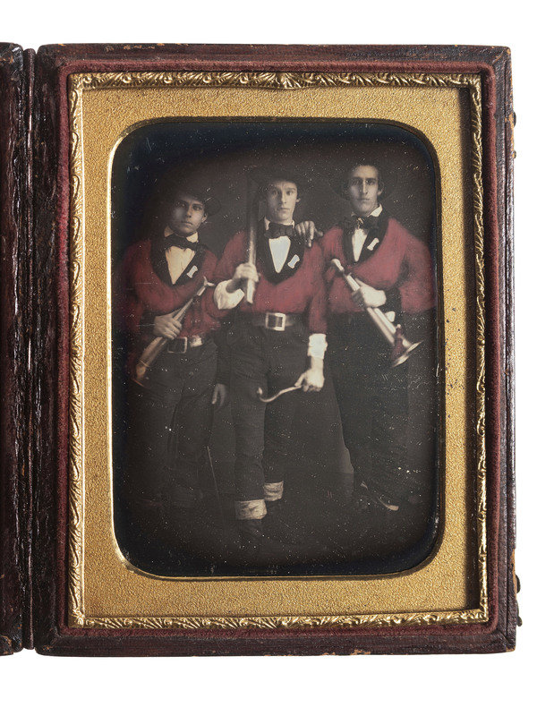 Quarter plate hand-tinted daguerreotype studio group portrait of three firefighters. (Tarnish to perimeter, resealed.) Housed in full leather case with floral motif (scuffs to extremities, hinge rebacked). The three firefighters wear distinctive hand-colored red jackets with dark lapels and an unidentified badge. They hold an axe, a fireman's hook, and firemen's trumpets, including a double trumpet. (Included is dealer's description from 1979).