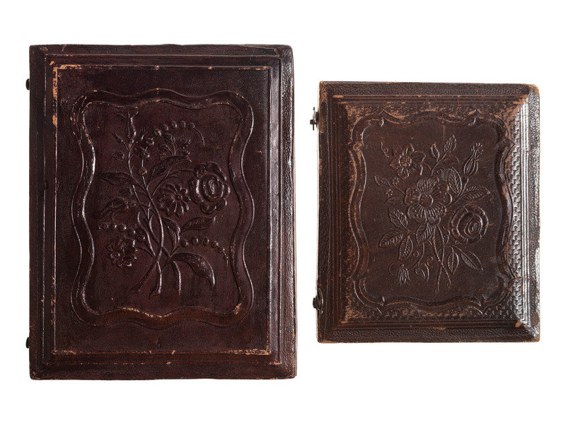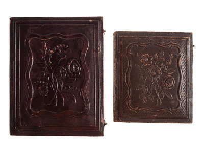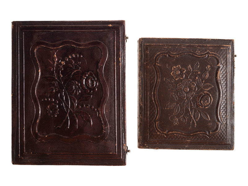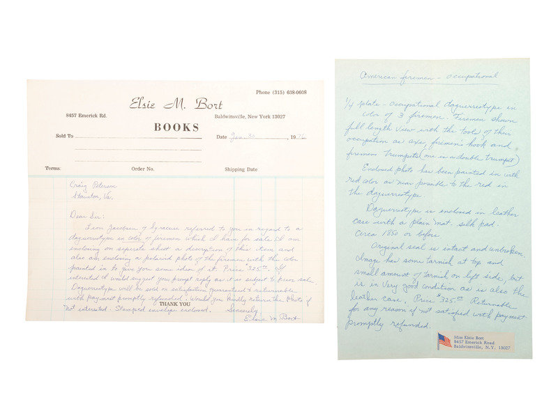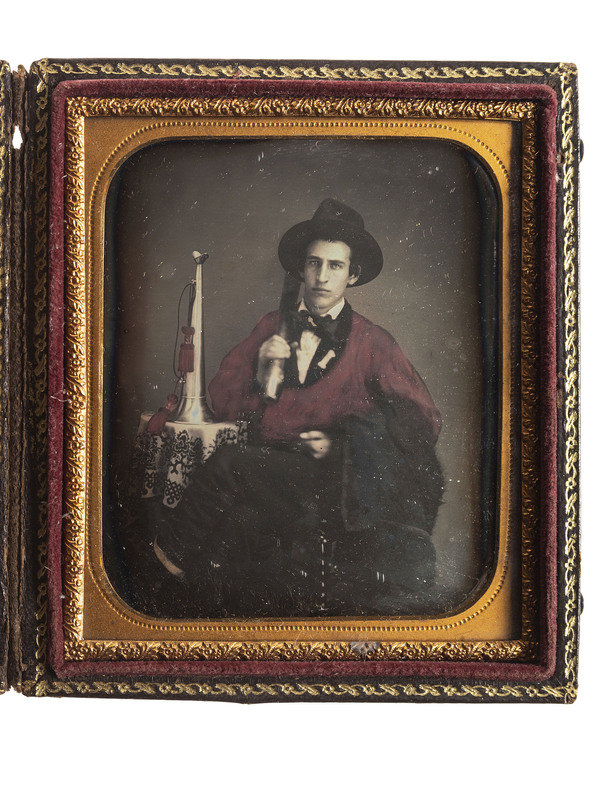 [With:] Sixth plate hand-tinted daguerreotype studio portrait of a firefighter. (Tarnish to perimeter (original seal partially intact, tarnish to perimeter.) Housed in full leather case with floral motif (scuffs to extremities). The young firefighter wear a hat, a red hand-tinted jacket, and holds an axe. His trumpet with red tassels is placed on a table next to him.