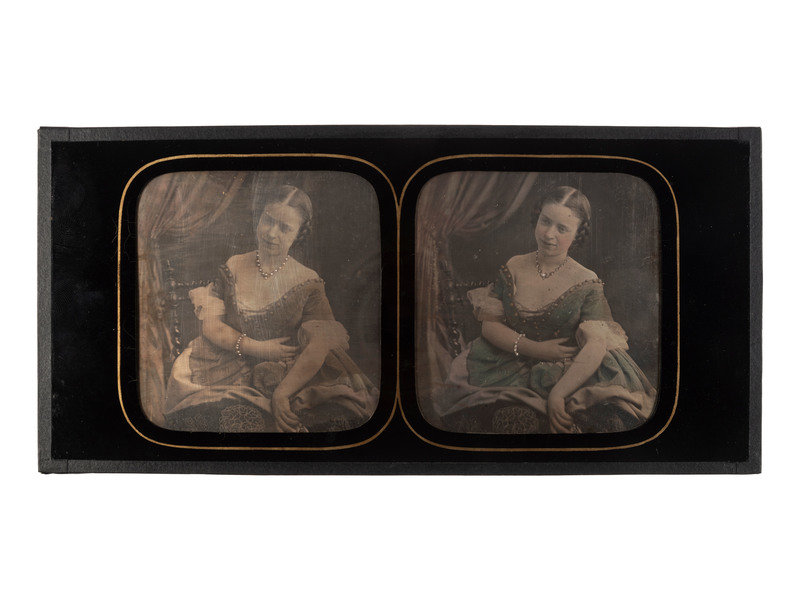6 7/8 x 3 1/4 in. stereodaguerreotype with hand coloring. (Some brushing/wipes to surface, tarnish to edges, occasional spotting). Likely French.