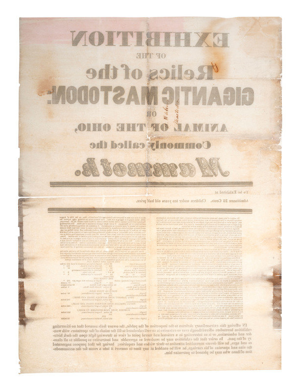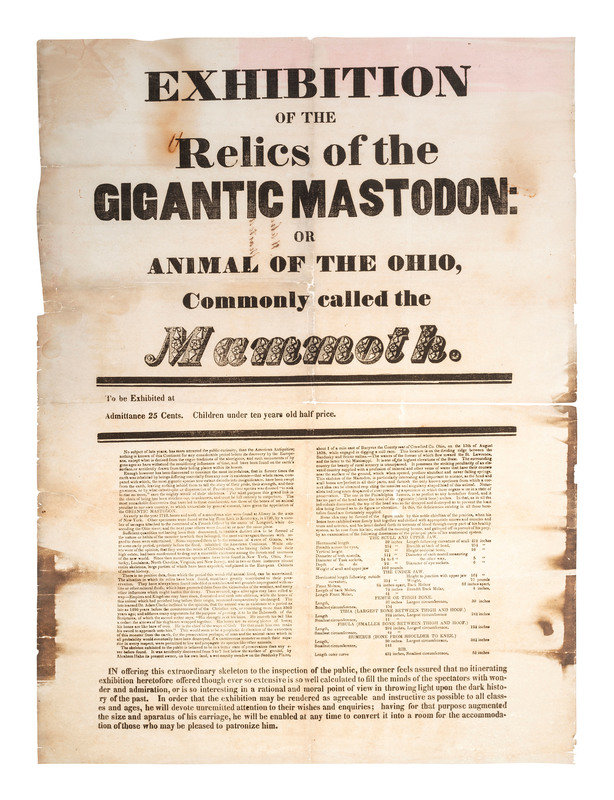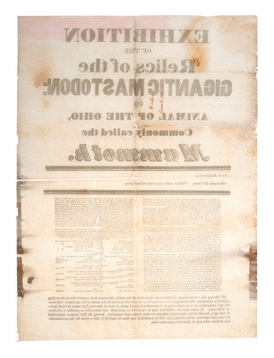 Broadside announces the exhibition of a recently discovered "gigantic mastodon" specimen, leaving a blank area for the location of the exhibition to be accomplished in manuscript (left blank here). Fine printed text to lower half of broadside details the history of scientific findings related to the mastodon, including discoveries of bones, teeth, and other specimens in years past, and emphasizing the importance and peculiarities of the most recently discovered specimen found by Abraham Hahn on his property near Bucyrus, Ohio, on 13 August 1838. "(T)he head and scull bones are perfect in all their parts...In this, the deficiencies existing in all those heretofore found are fortunately supplied." Measurements of various bones in the skeleton are then listed.