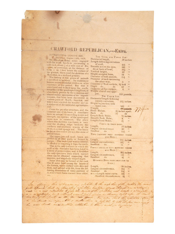 [With:] 7 7/8 x 12 1/2 in. newspaper extra from the Crawford Republican reporting on the discovery of the Hahn Mastodon (spots of soiling and discoloration, creasing, and wear to edges and corners). Page features handwritten edits and inscriptions, including "X" marks drawn over certain paragraphs, a correction made to one of the jaw measurements given, and an inscribed paragraph at the bottom, which is reproduced in print at the bottom of the broadside.