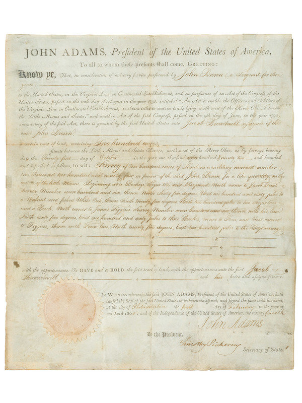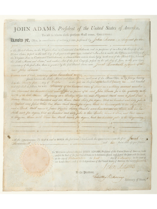 A military land grant, issuing two hundred acres between the Little Miami and Sciota Rivers northwest of the Ohio River to John Brown, who served as Sergeant for three years, "in consideration of military service...to the United States, in the Virginia line on Continental Establishment, and in pursuance of an Act of the Congress of the United States." The Virginia Military District comprised a nearly four-million-acre tract of land in the southwestern part of Ohio. State officials used land grants to reward veterans for their military service in lieu of payment. In order to promote recruitment, Washington offered tracts of land in exchange for three or more years of service to the Continental Army during the war.