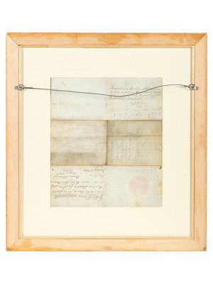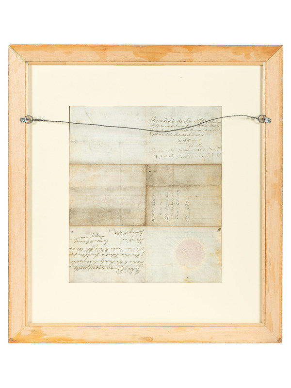 1 page, 15 x 13 1/4 in, on vellum, paper seal at bottom, creased with minor soiling and a few small holes, window-mounted and framed, unexamined out of frame. Additionally inscribed on verso by Secretary of War James McHenry (31 January 1800), and Jacob Wagner. Docketed verso.