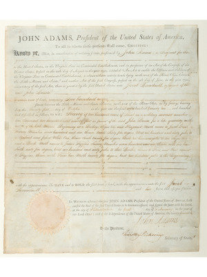 ADAMS, John (1735-1826). Partially engraved document accomplished in a secretarial hand signed ("John Adams") as President, countersigned by Secretary of State Timothy Pickering, 1 February 1800.