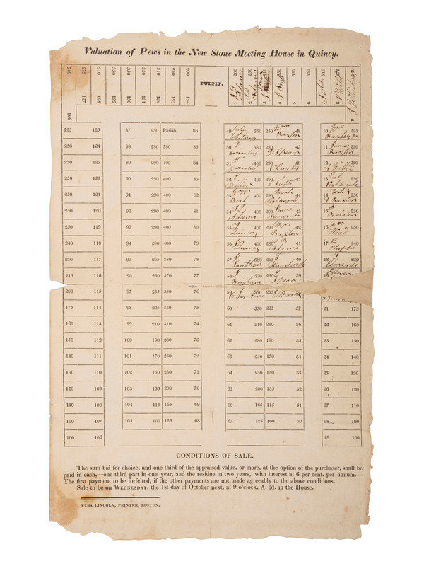 [ADAMS, John Quincy (1767-1848)]. Valuation of Pews in the New Stone Meeting House in Quincy. Boston: Ezra Lincoln, [1828].