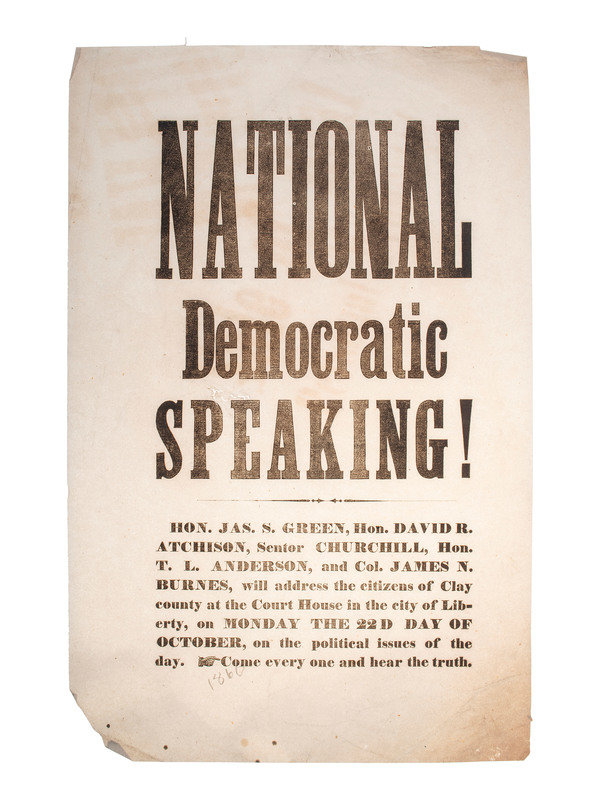 A broadside advertising a pro-Breckinridge campaign event in Liberty, Missouri. notably including David Rice ATCHISON (1807-1886) as a featured speaker. The former Democratic senator from Missouri (1843-1855) was a veteran of the Missouri State Militia during the Mormon War of 1838 and a prominent Border Ruffian and pro-slavery advocate during the Bleeding Kansas years. Supporting secession, he was appointed a major general in the Missouri State Guard and successfully led State Guard recruits in the Battle of Liberty. After Pea Ridge, Atchison spent the remainder of the war in Texas.