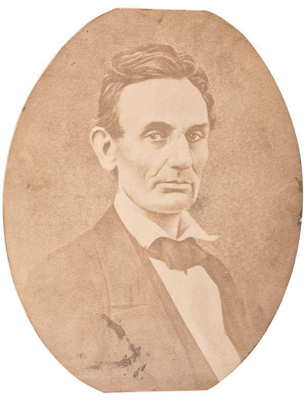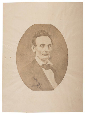 5 3/8 x 7 in. retouched salted paper print on 8 1/2 x 11 1/2 in. paper mount (small chip along right edge, few blotches to lower left). Period copy portrait of a beardless Abraham Lincoln, originally taken in Chicago, 4 October 1859 at the Cooke & Fassett Gallery (O-16).