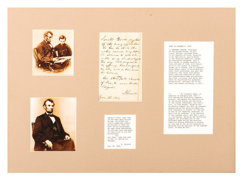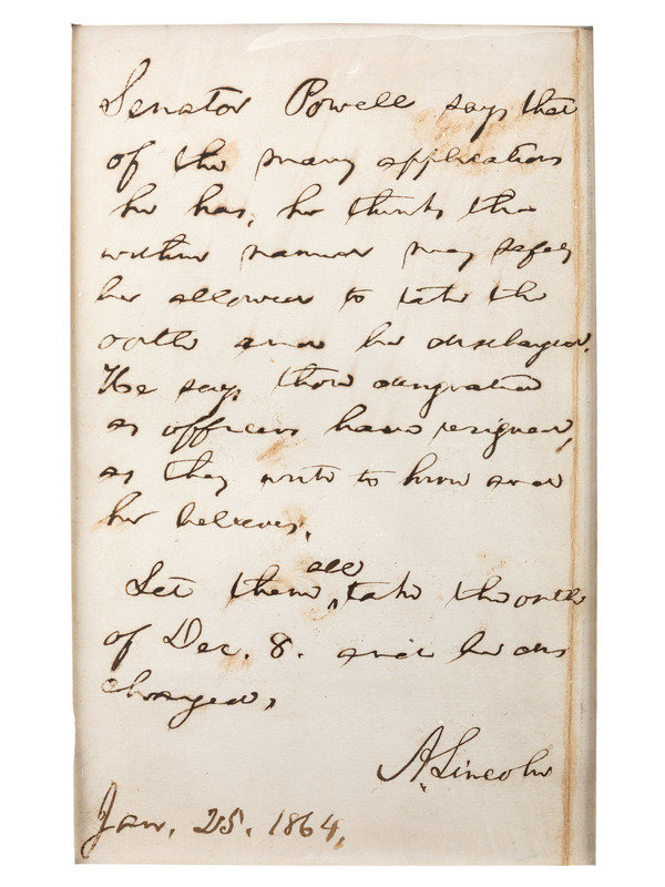 In full: "Senator Powell says that of the many applications he has, he thinks the within named may safely be allowed to take the oath and be discharged. He says those designated as officers have resigned as they write to him and he believes. Let them all take the oath of Dec. 8. and be discharged. A. Lincoln."