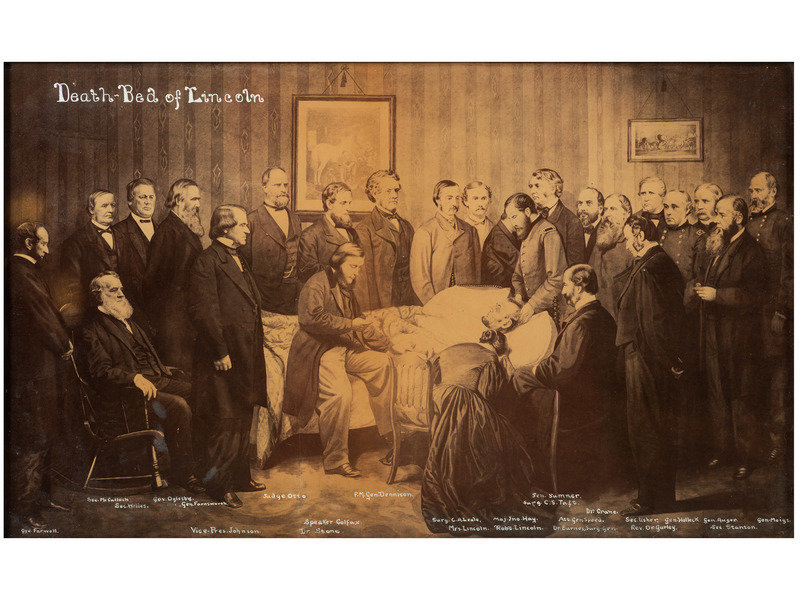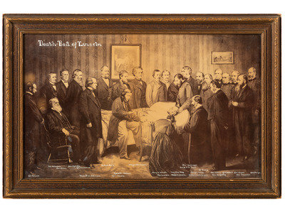 17 3/4 x 10 3/4 in. (visible) albumen print, housed in 21 x 14 in. frame (even toning, unexamined outside frame). Print after painting by John H. Littlefield, Death-Bed of Lincoln, April 15, 1865. With "John Goldin, Photo. / Wm. Terry, Printer" printed at lower right.