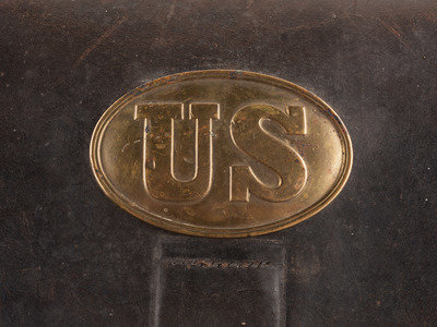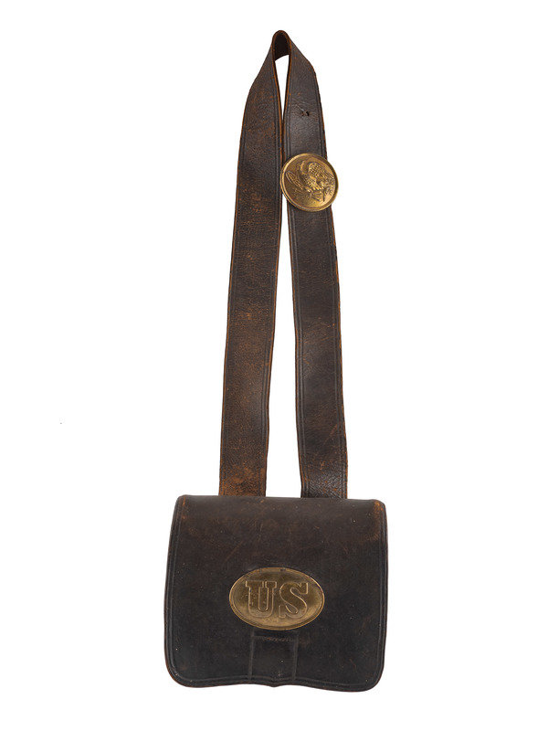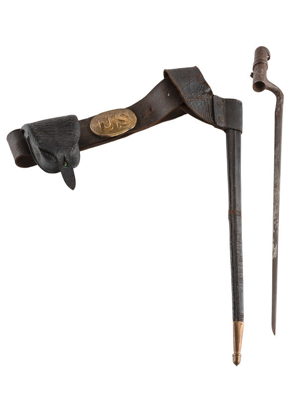 Union infantry belt rig including Model 1855 cartridge box retaining tins and bearing "US" box plate attached with leather thong, sling with eagle breast plate, leather waist belt with oval "US" belt plate with arrow hooks, percussion cap pouch, and bayonet with black leather scabbard and frog with riveted belt look. Bayonet for a .58 cal. rifle musket. Sling original to the box as both sling and box flap have impressed two-line edge. Wear to leather belt, plate is bright. Wear to scabbard, particularly at center length. Expected wear on all components but in overall good condition.