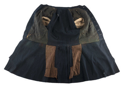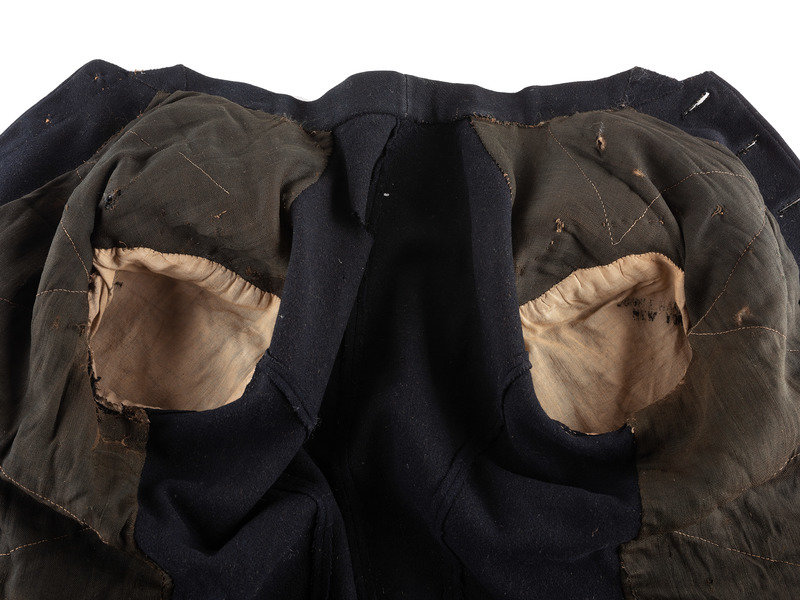 A few small pin-head sized remnants of the original blue taping still visible along collar. Coat with evidence of field repairs. Coat with scattered mothing and wear. Approx. 1 3/4 in. tear at back right. Scattered small holes including at right elbow, below third coat button, and bottom front left of skirt. Interior lining with wear, small tears, and some separation along seams.