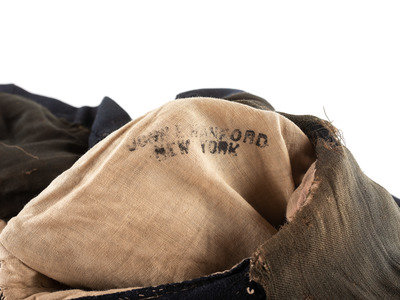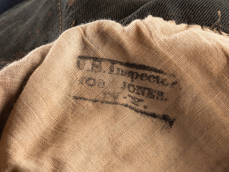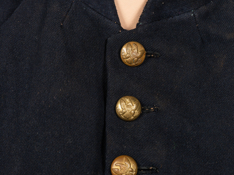 Navy blue nine-button enlisted man's frock coat. General service coat buttons RMDC with Scovill and Waterbury Button Co. backmarks. Both non-functional cuffs with a pair of small general service eagle buttons. Two coat-size buttons at top of rear vent both marked with Waterbury backmark. Interior of coat lined at chest but not back with stitched green cotton lining. Sleeves with white cotton lining. Right sleeve with black stamp "U.S. Inspector / Jos. Jones. / N.Y." Left sleeve with black stamp "John E. Hanford / New York." Pockets at the tails.