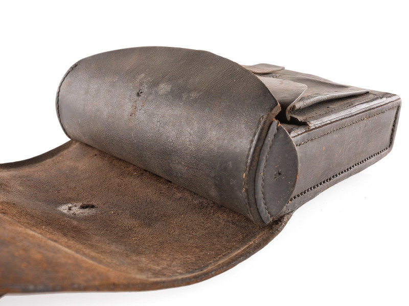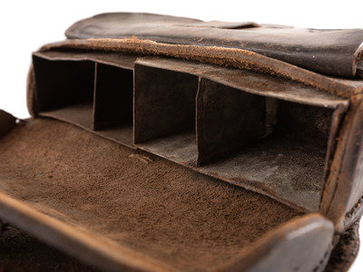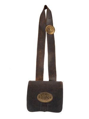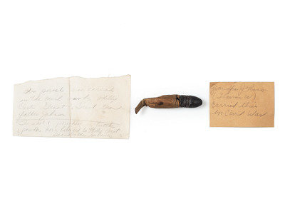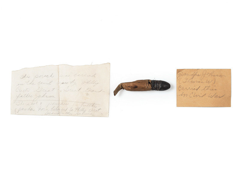 [With:] Two handwritten penciled notes, both post-war date, and original to this grouping. One note, 3 x 2 1/8 in., on back of a receipt, reads: "Grandpa Johnson / (Thomas W.) / carried this / in Civil War" [undetermined which specific piece the note identifies]. Second note, approx. 1/2 x 2 3/4 in., reads: "This pouch was carried / in the Civil War by Phillip / Curtis great Great Grand - / father Johnson / The shot & powder in battles / & powder horn [not included in the grouping] belonged to Phillip Great / Grandfather Holmes."