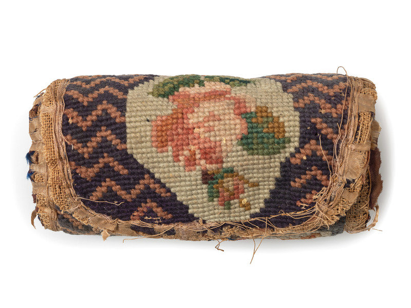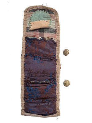 [Also with:] Shot and powder, and a decoratively cross-stitched housewife. When unrolled, the interior of the housewife features four pockets and patches pinned in at upper portion. Top pocket with a group of seven buttons. Lower pockets with remnants of a note identified in one place with the name "Catharine Reeve" and featuring ornate floral motifs in brown ink.