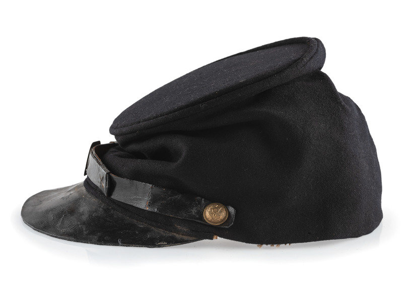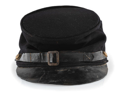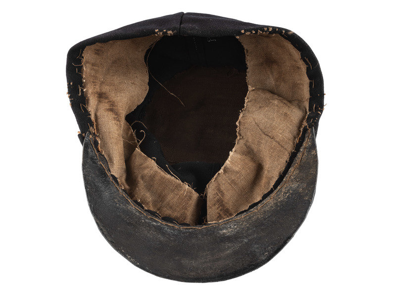 Dark blue wool forage cap with painted leather visor. Visor to crown, approx. 4 1/4 in., and 6 in. rise at rear. Small brass buckle and staff eagle buttons on each side of intact leather strap, appear to be period replacements. No interior leather sweatband, polished cotton lining, or manufacturer's label. Approx. 3 in. strip of cotton handsewn into cap. Scattered mothing and heavy wear, particularly to interior of cap.