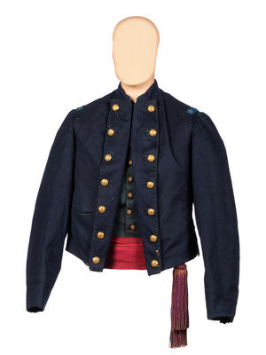 Scattered mothing on jacket with wear and light soil. Strap on right shoulder of jacket is unstitched on one end. Four coat buttons no longer sewn to coat, affixed with pins, and may not be original to jacket. Vest with one button affixed with a pin, wear and fading from use, but generally in good condition. Sash with several small holes near tassel at one end.