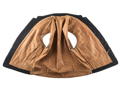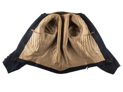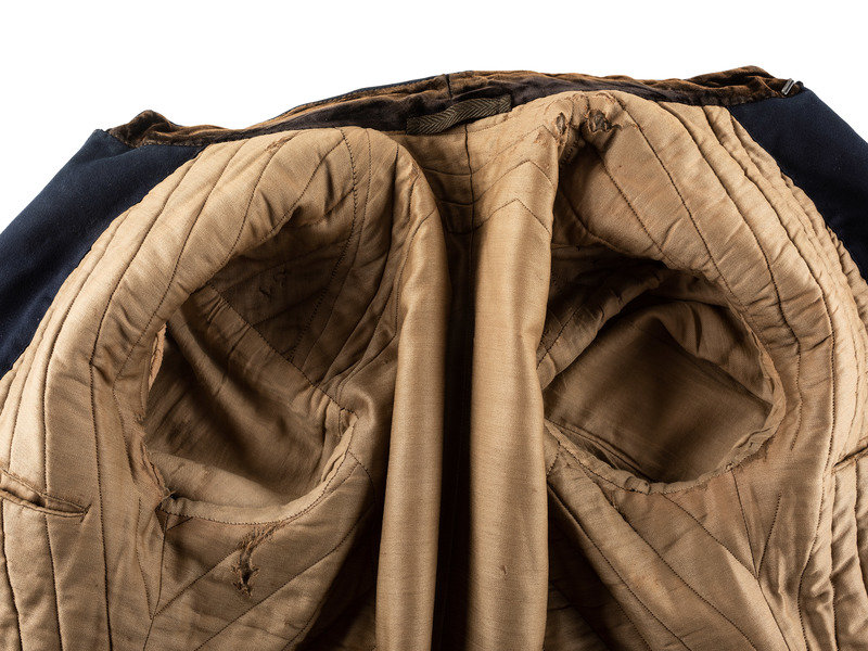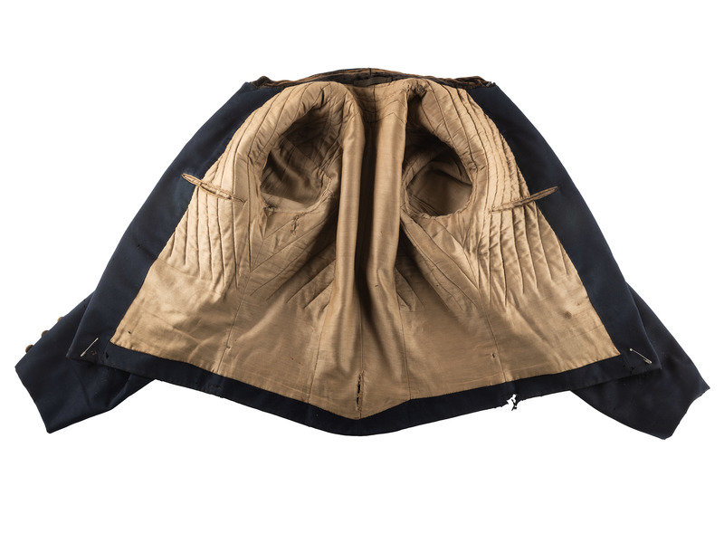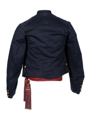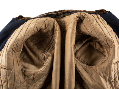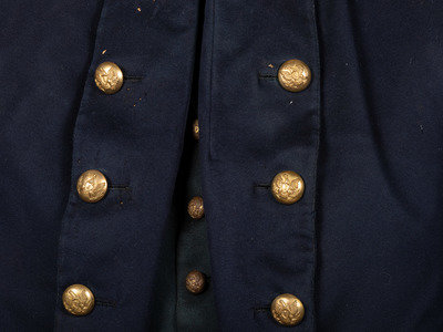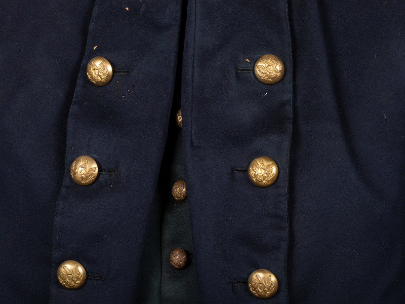 Navy blue seven-button, double-breasted short coat or roundabout with velvet-lined collar. Non-regulation lieutenant colonel insignia applied to 1 x 3 1/4 in. light blue wool folded over paper backing and sewn to the shoulders. Infantry eagle buttons on coat and cuff backmarked "Extra Quality" and "Waterbury Button Co." Three-button non-functional cuff. Sleeve approx. 9 1/2 in. width at elbow. Waist belt loops closed by eagle button at top and right outside pocket added most likely after jacket was cut-down. Sleeve, body, and pocket linings in place. Coat with tan polished cotton quilted lining and sleeves lined in white cotton. Coat with interior breast pocket on each side.
